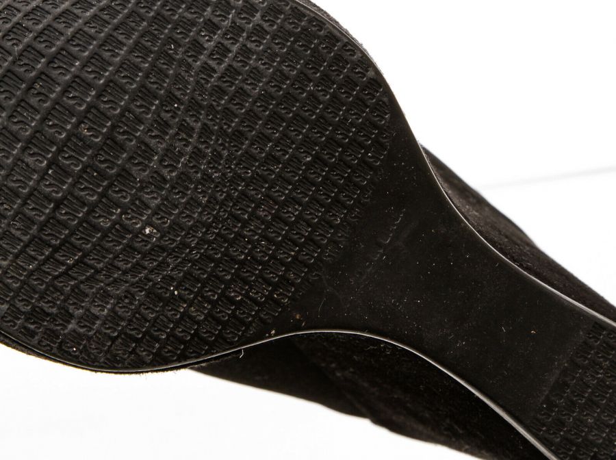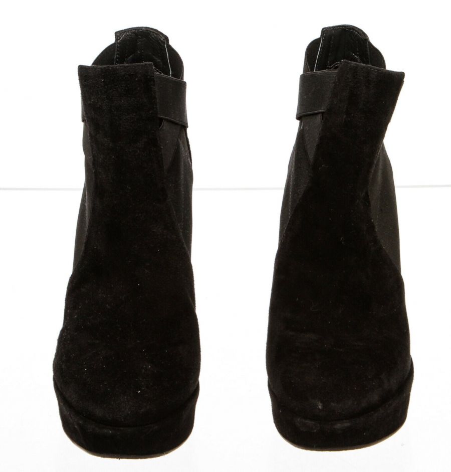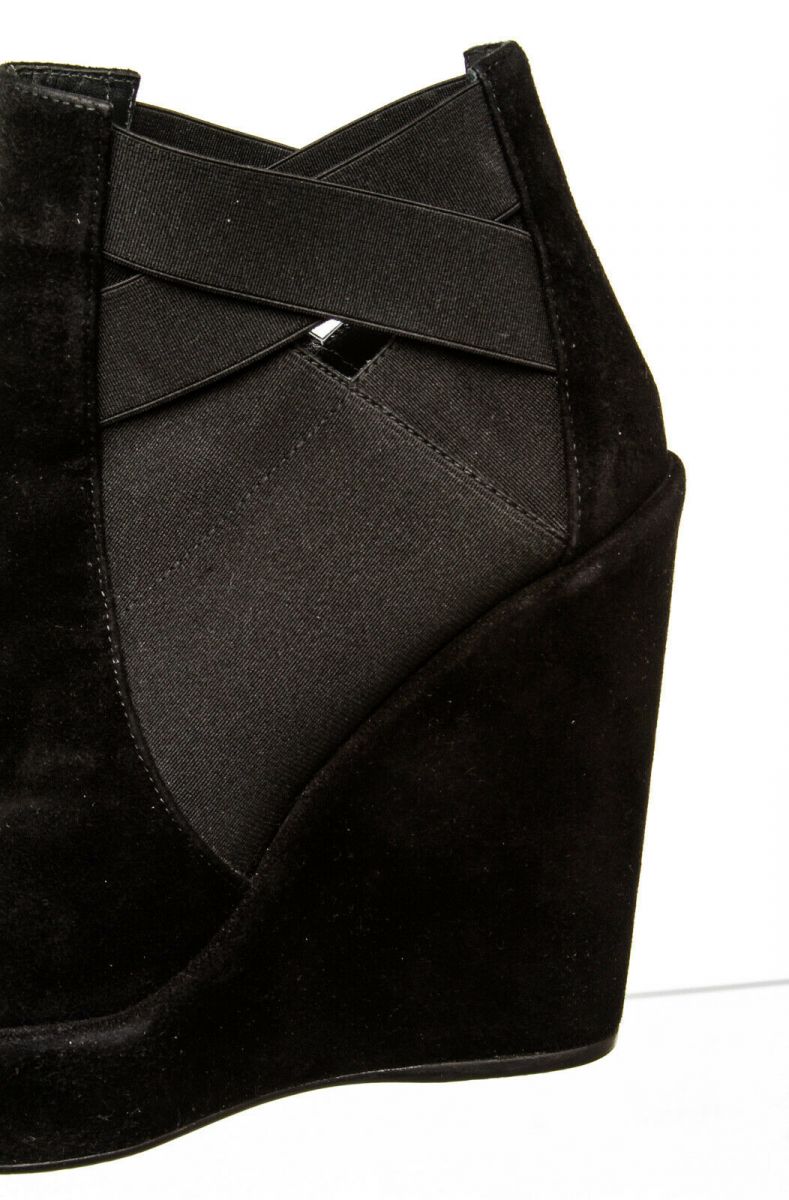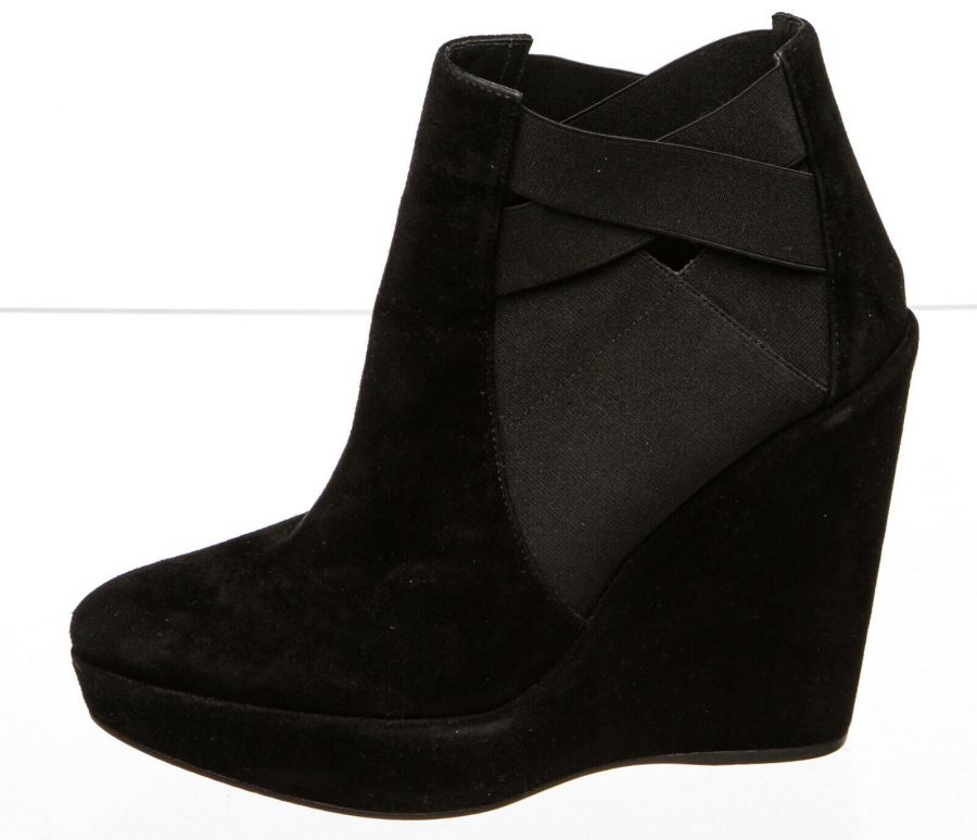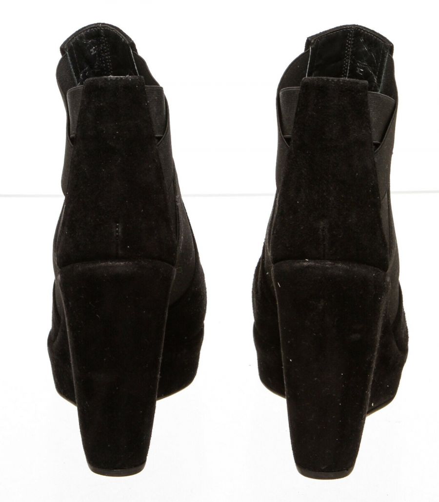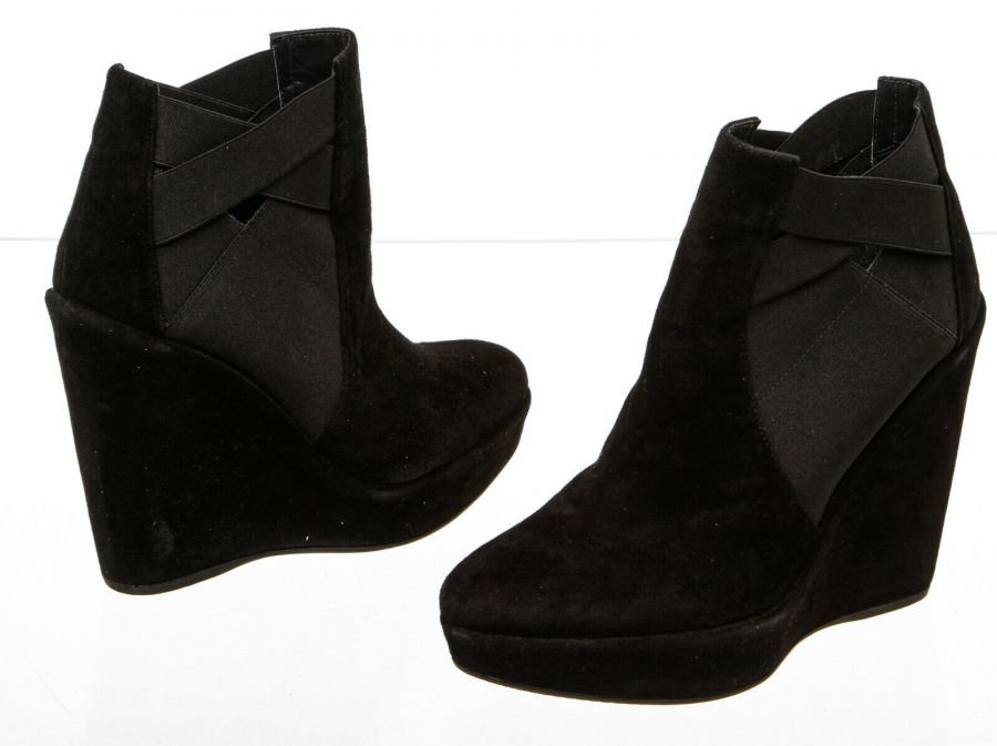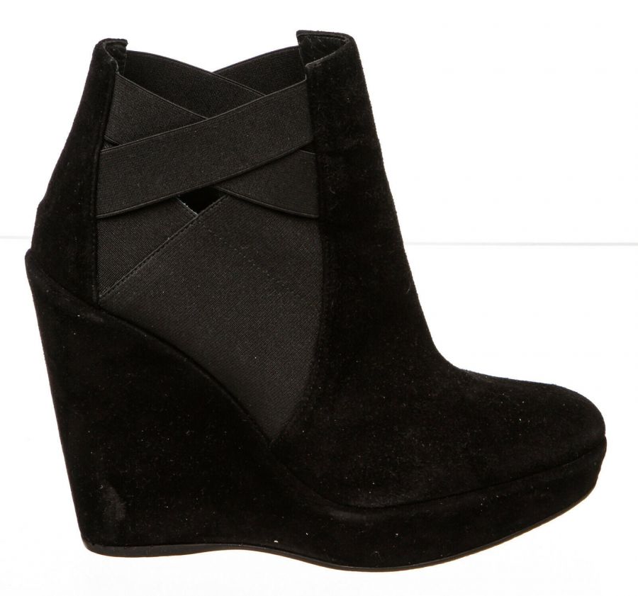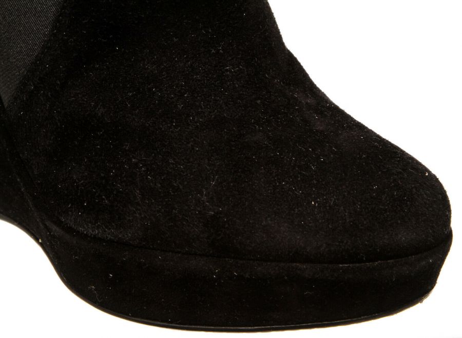 Black  pull-on suede bootie that features a round toe, elastic insets, wedge heel and rubber sole.