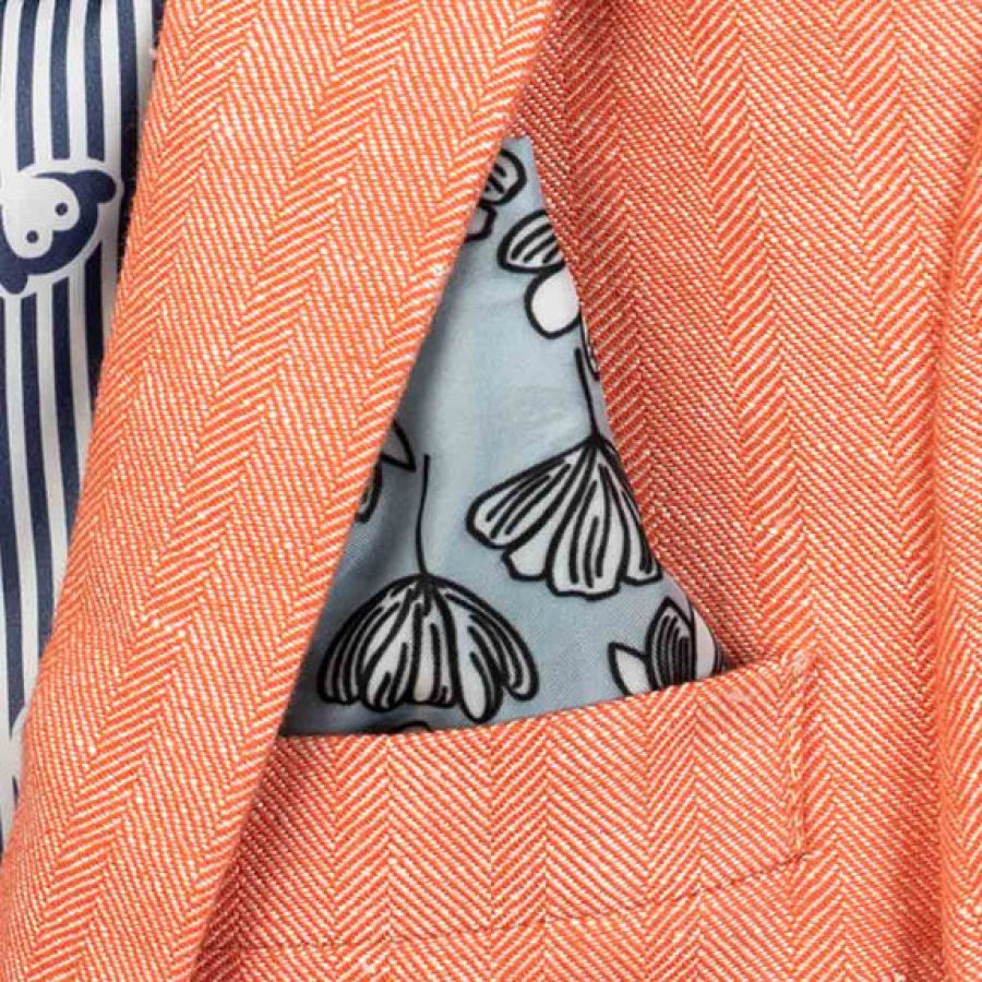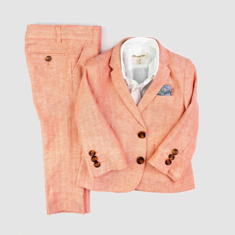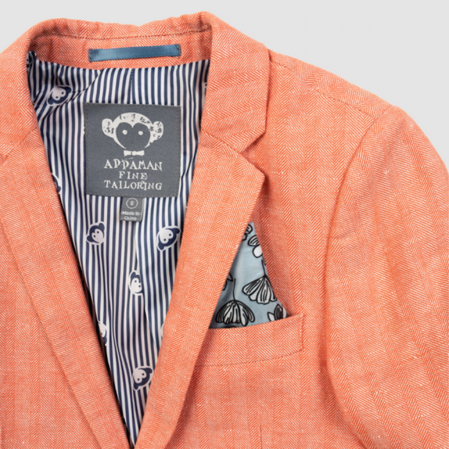 Our classic Mod Suit is thoughtfully tailored and modern. It's got a slim cut that you would expect from men's suiting, but with practical additions that keep your kids in mind. This spring weight orange-coral suit has a herringbone weave texture and comes with a built in pop-up pocket square.