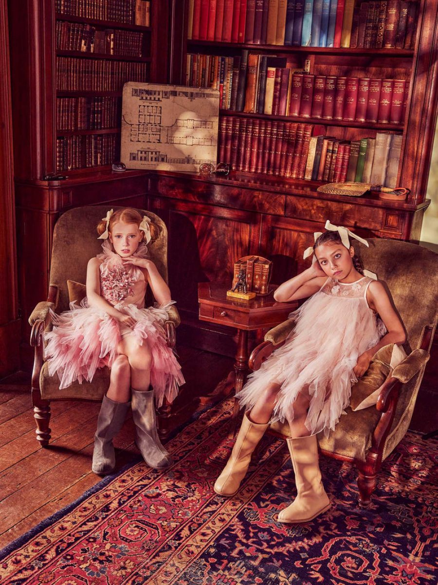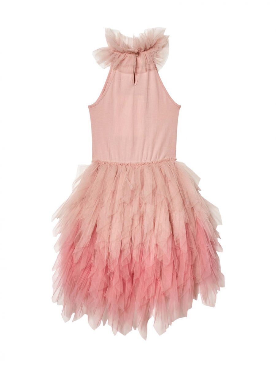 There is an elasticated waist for comfort and vertical gathered ombre tulle layers create a high-volume silhouette as well as a back button for ease.