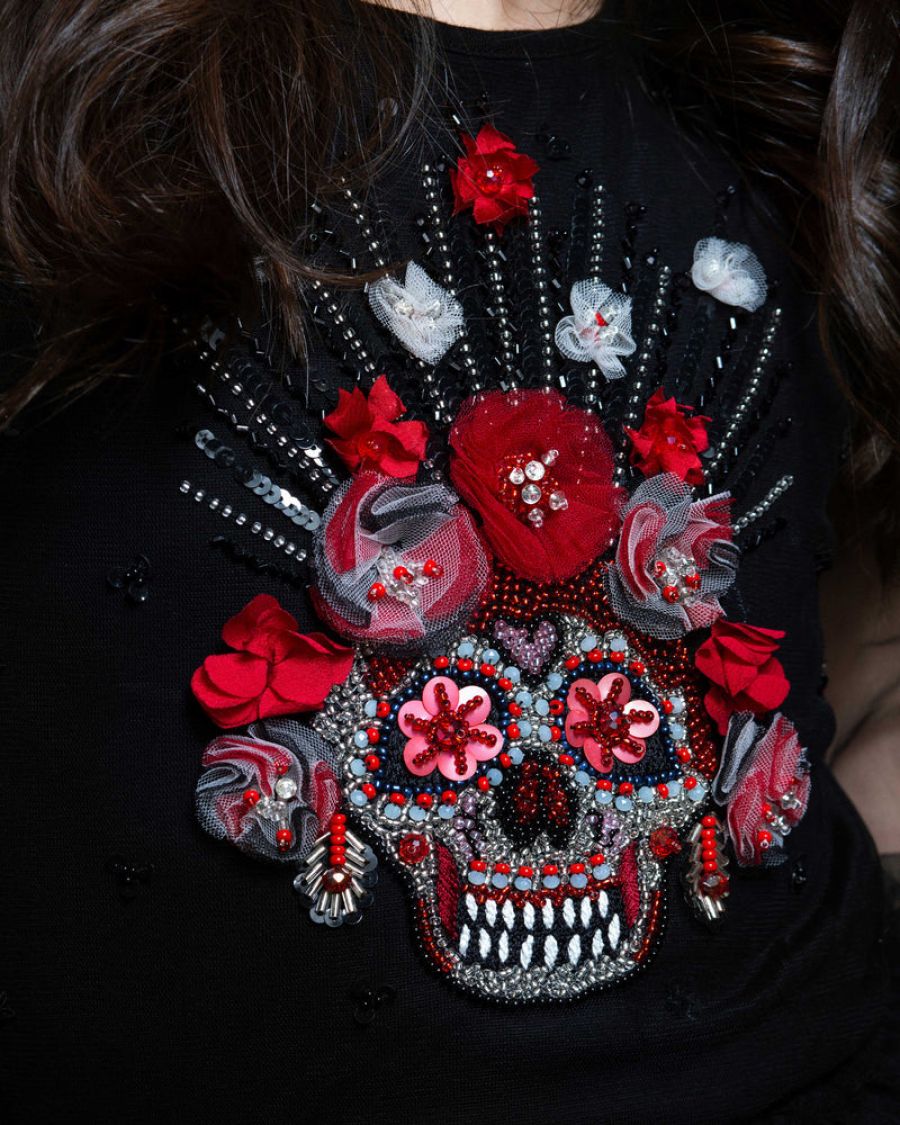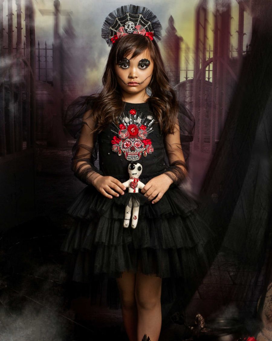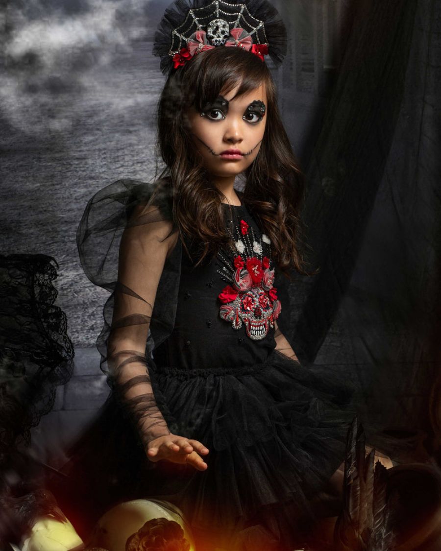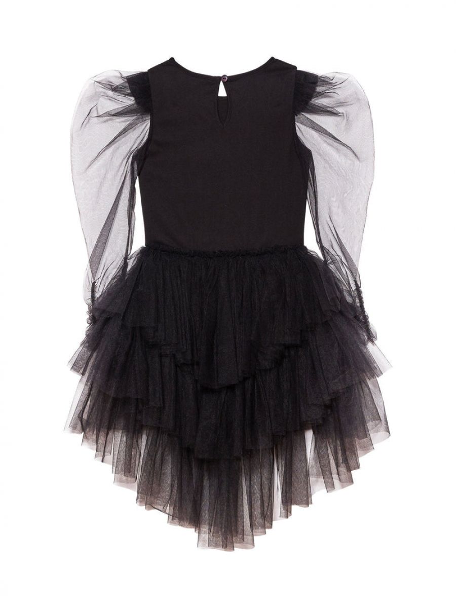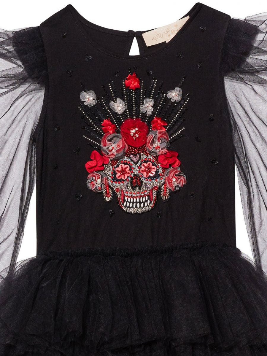 Darkly dazzling sequins and crystals stud the bodice in a sparkling sugar skull design, featuring a dramatic silhouette created by the hi lo tulle skirt which cascades in dramatic layers of finest black tulle, and stunning sheer gathered puffy sleeves.