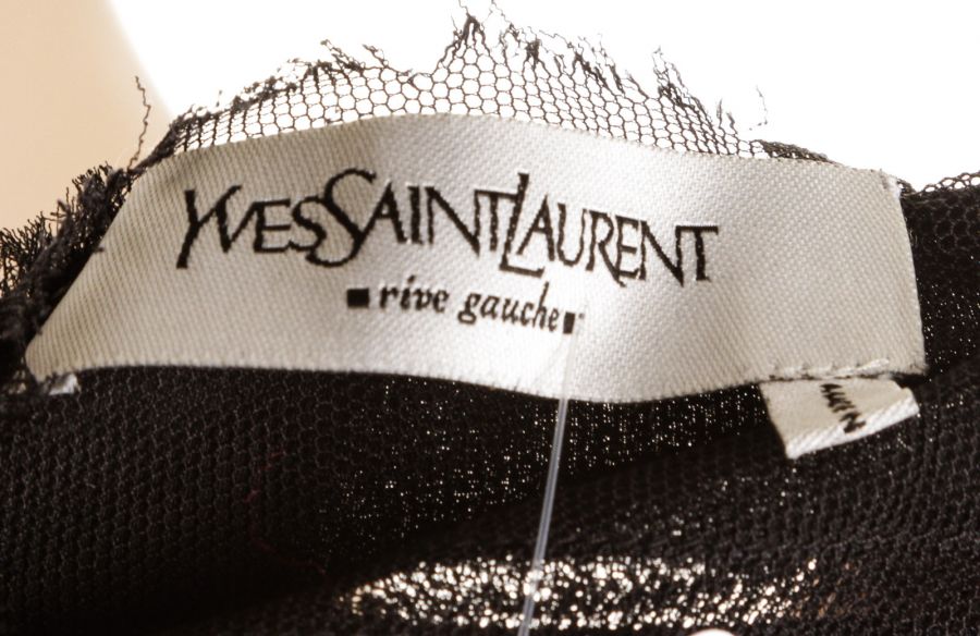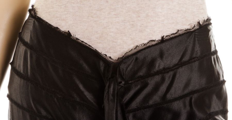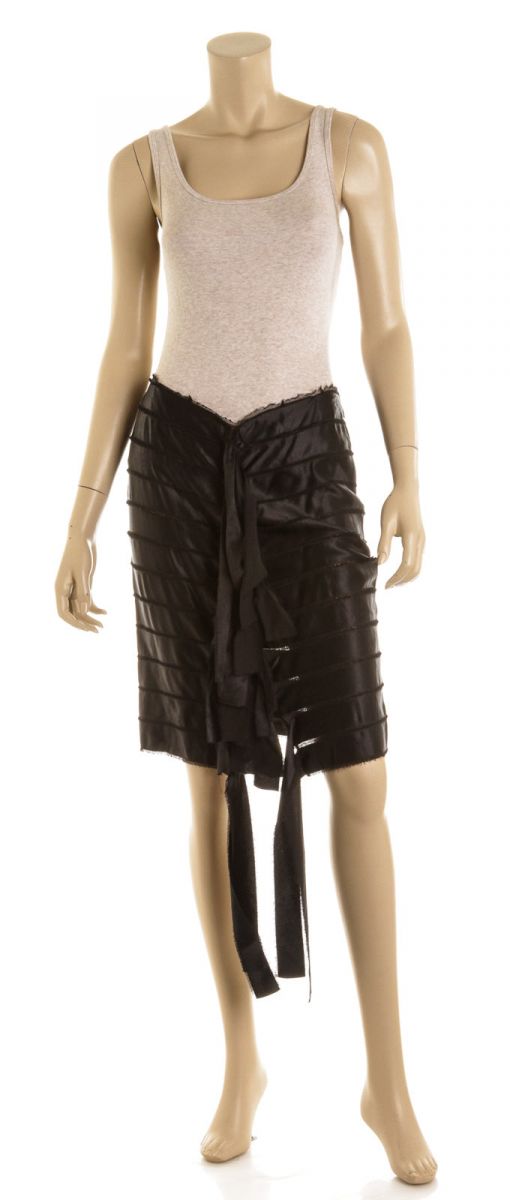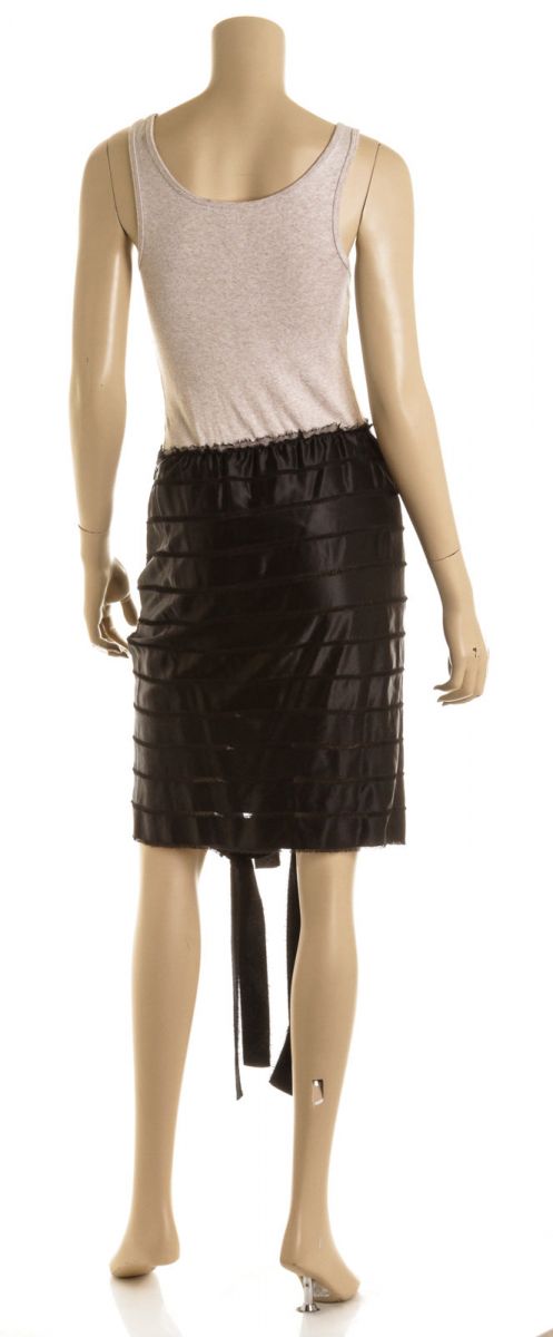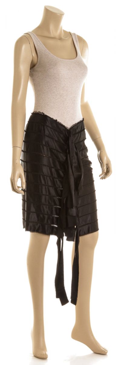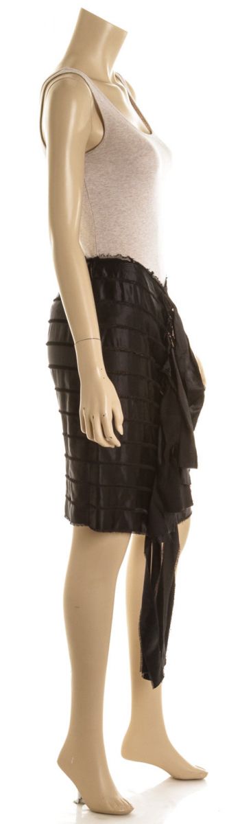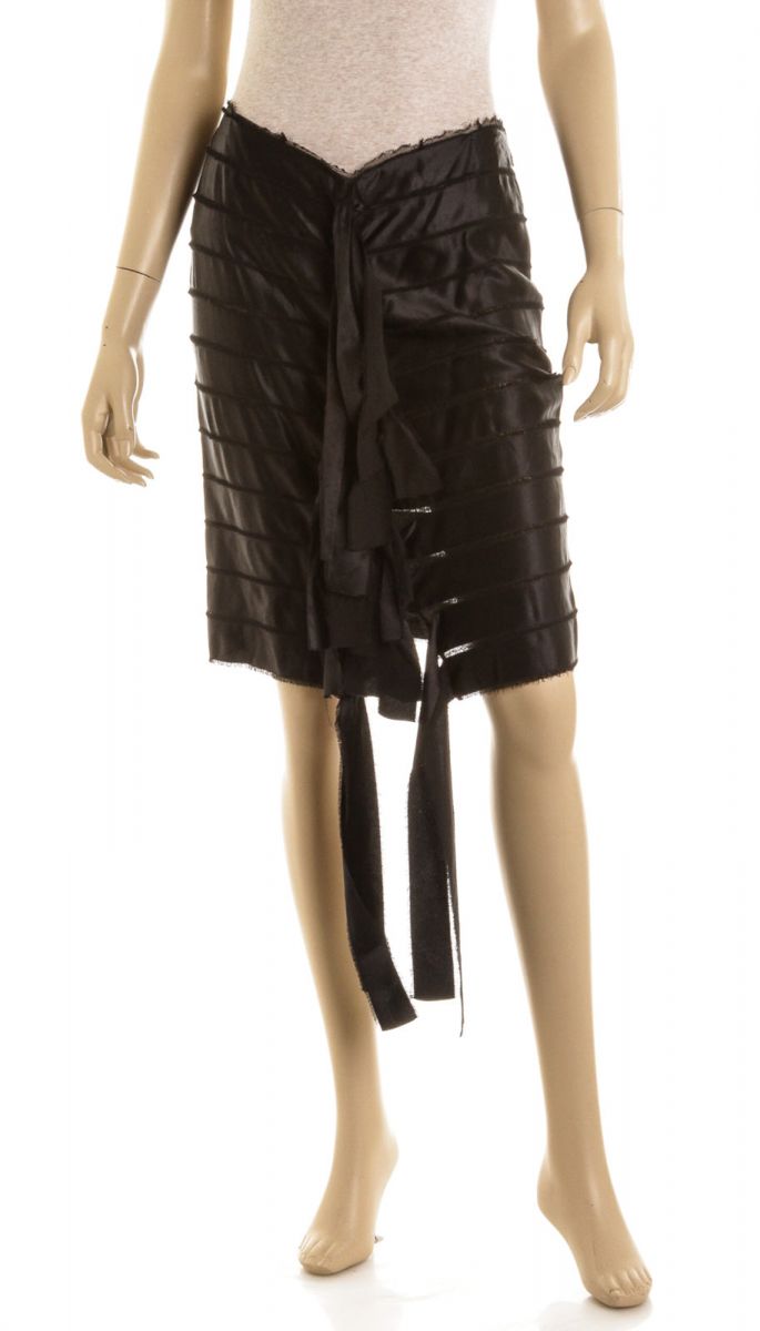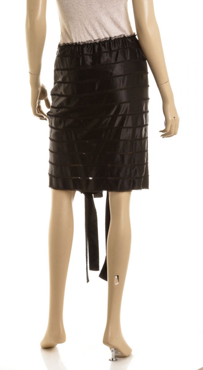 This YSL silk skirt features tiered striped ruffled front that hangs and back zip closure.